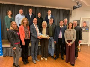 Als Gastgeschenk bekam Ulrike Scharf Köstlichkeiten aus dem Dachauer Land mit auf den Weg. Das Foto zeigt (untere Reihe vlnr) Johanna Baumann, Ramona Fruhner, mich, Ulrike Scharf, Stefan Löwl, Martin Hofmann, Burkhard Haneke, Stephi Burgmaier und Dieter Kugler. In der hinteren Reihe sind es – von links – Heidi Schaitl/Caritas, Peter Schadl, Dr. Tobias Glas, Alex Huber und Johannes Stadler.