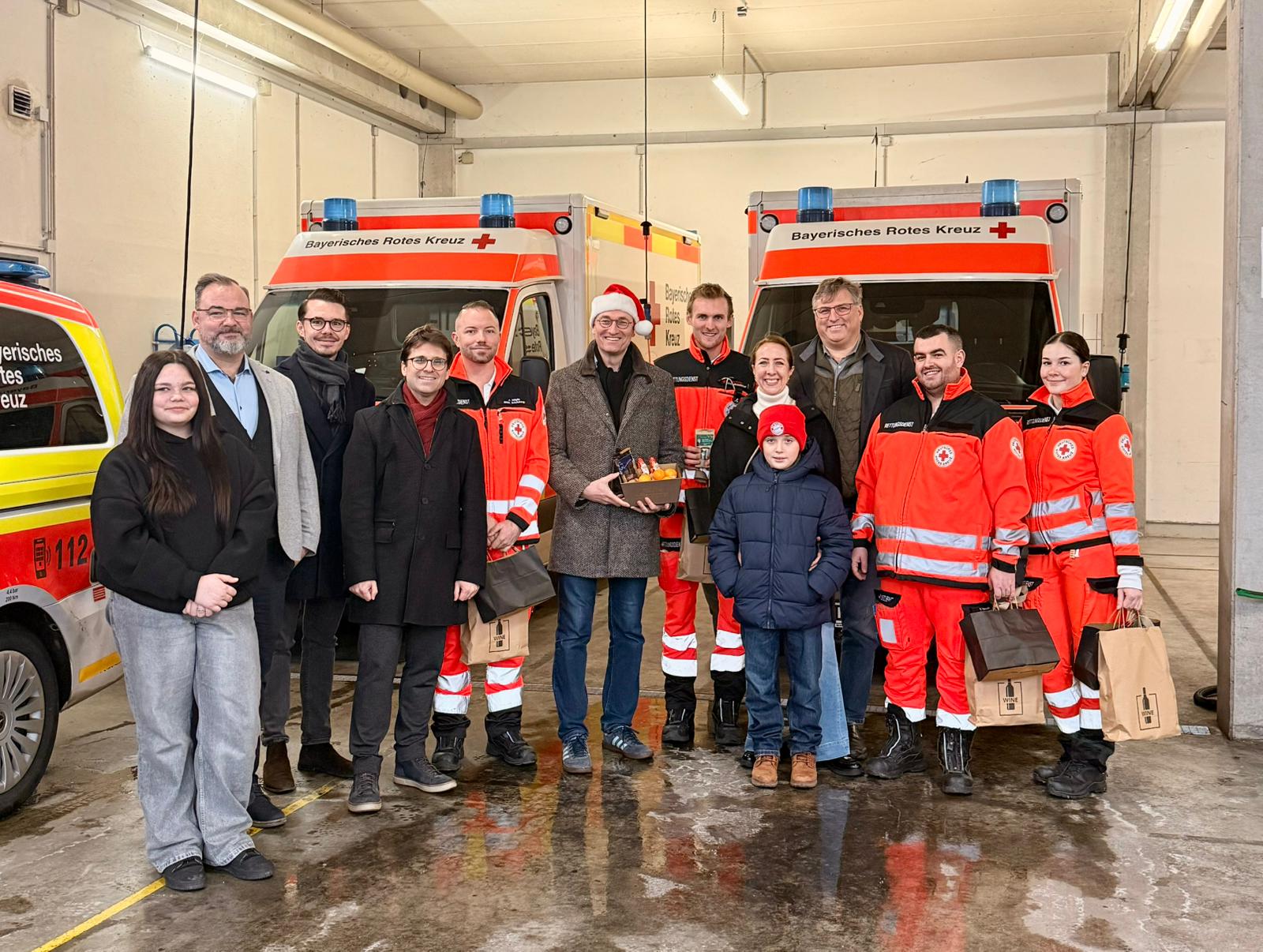 3 – vor der BRK-Ret­tungswache Inder­s­dorf — unter anderem mit Wach­lei­t­erin Denise Stalph, dem stel­lvertre­tenden BRK-Kreis­geschäfts­führer Michael Schäfer und Christoph Adler aus der Führungsebene des BRK-Rettungsdienstes,